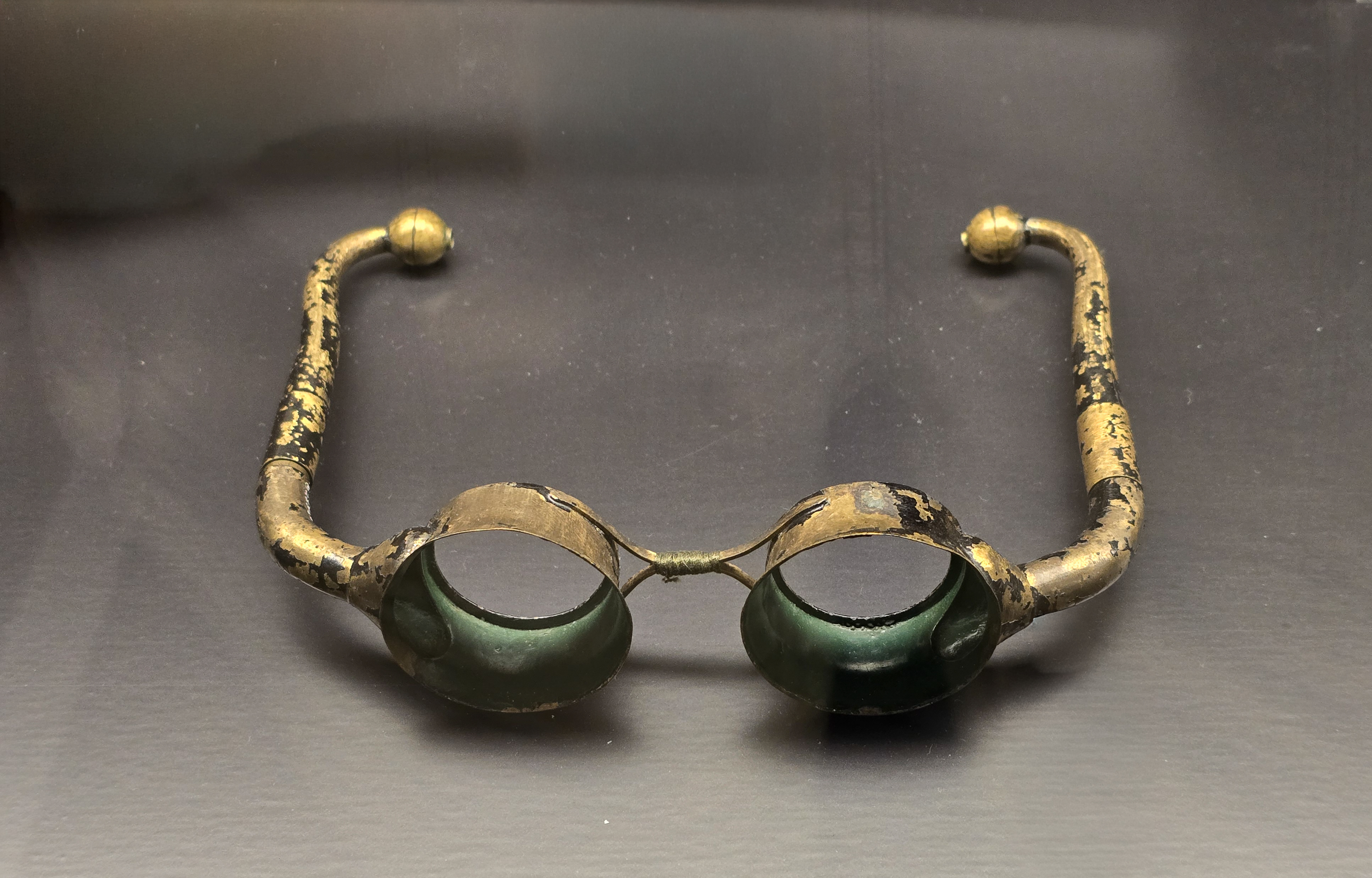 A hearing aid. Sound came in the front, around the eyes and was piped into the ears. No batteries required.