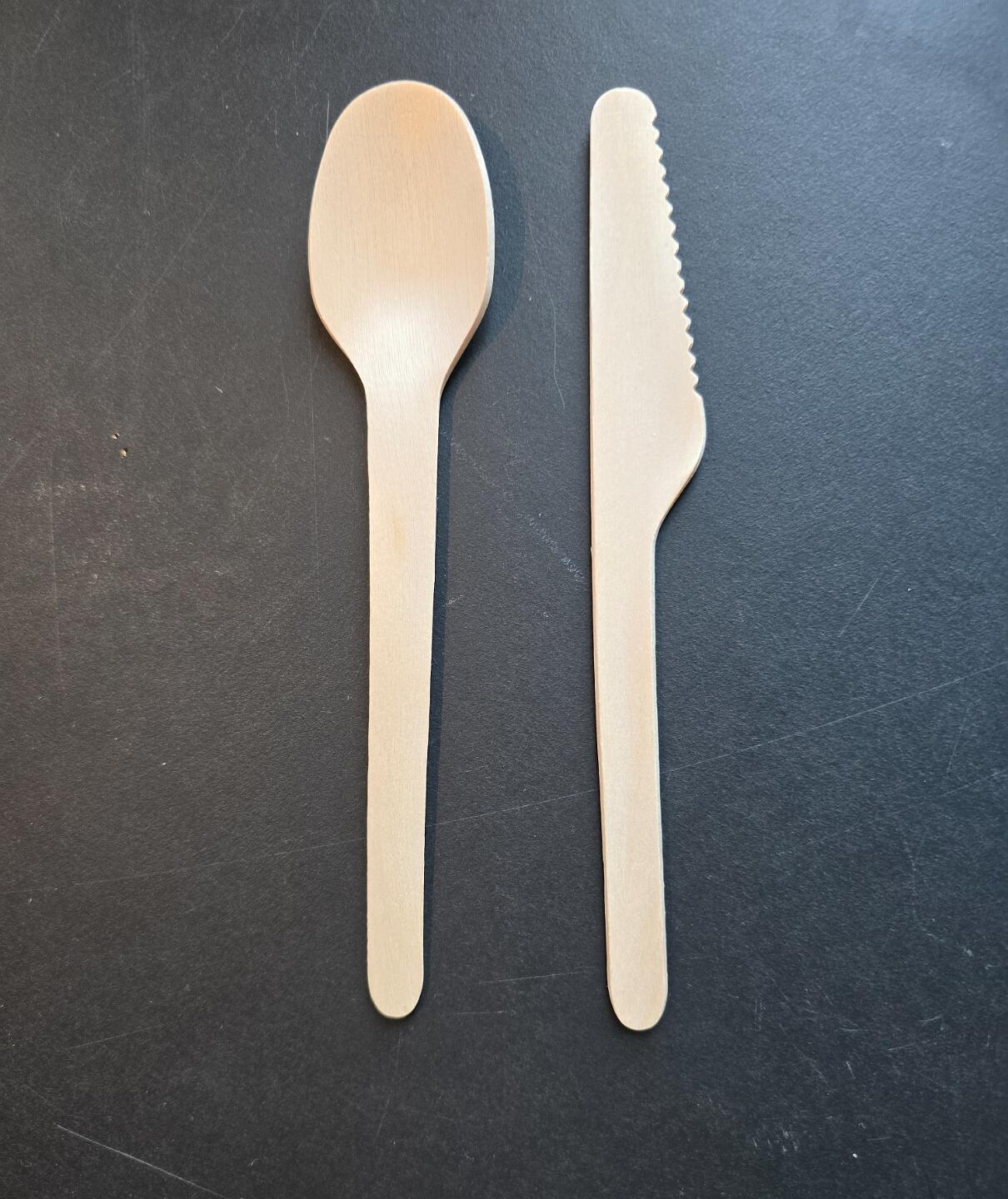 Wooden knife and spoon, probably pressed out of birch. Much better than plastic