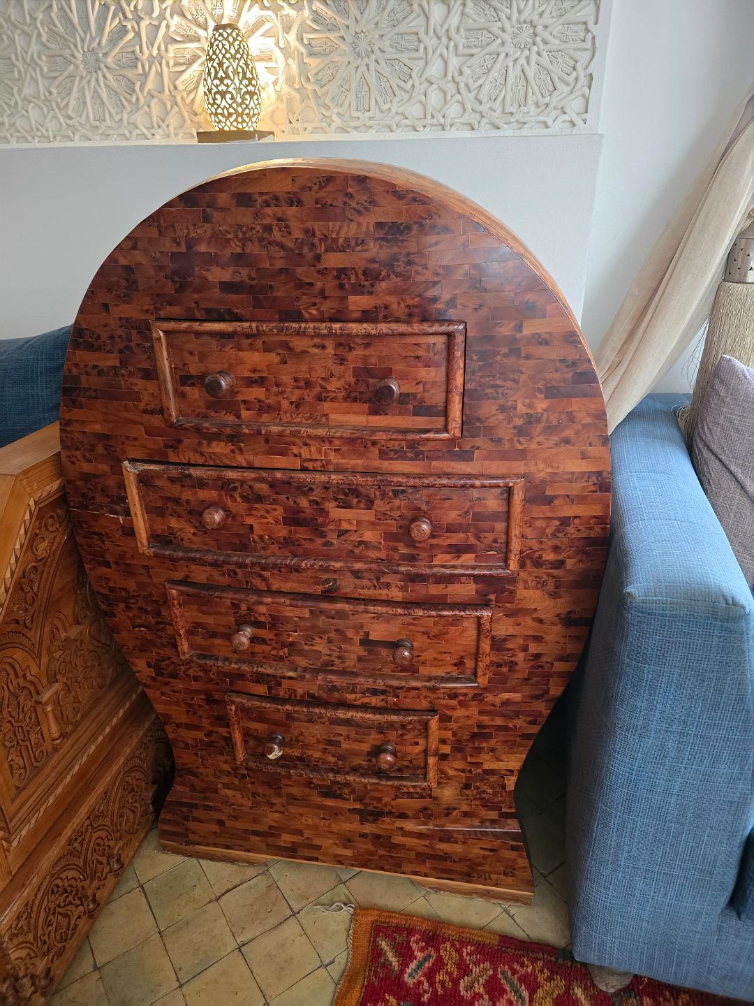 A hand made cabinet composed of hundreds of little scraps of wood.