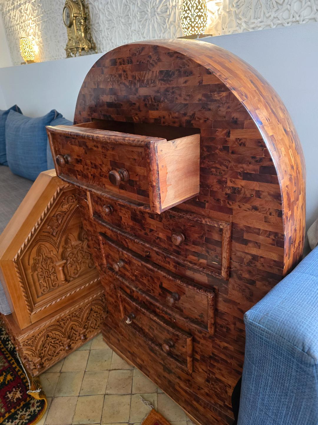 A hand made cabinet composed of hundreds of little scraps of wood.