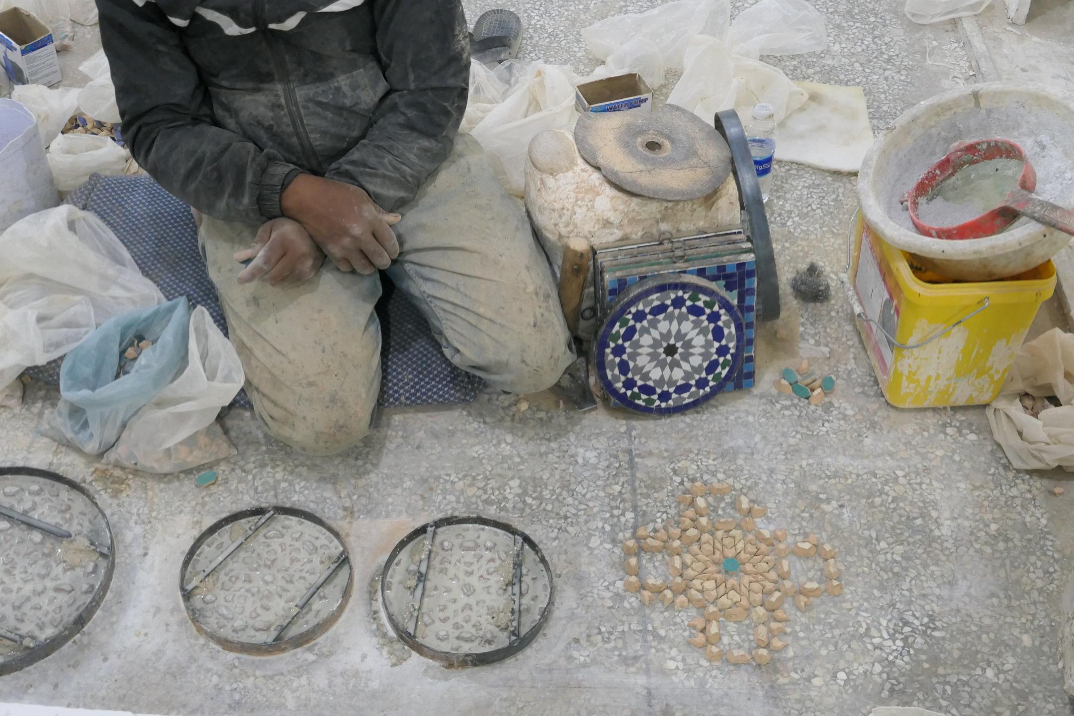 This buy was making a mosaic design by bits of colored ceramic face-down and the embedding them in resin. He could not actually see the design he was making.